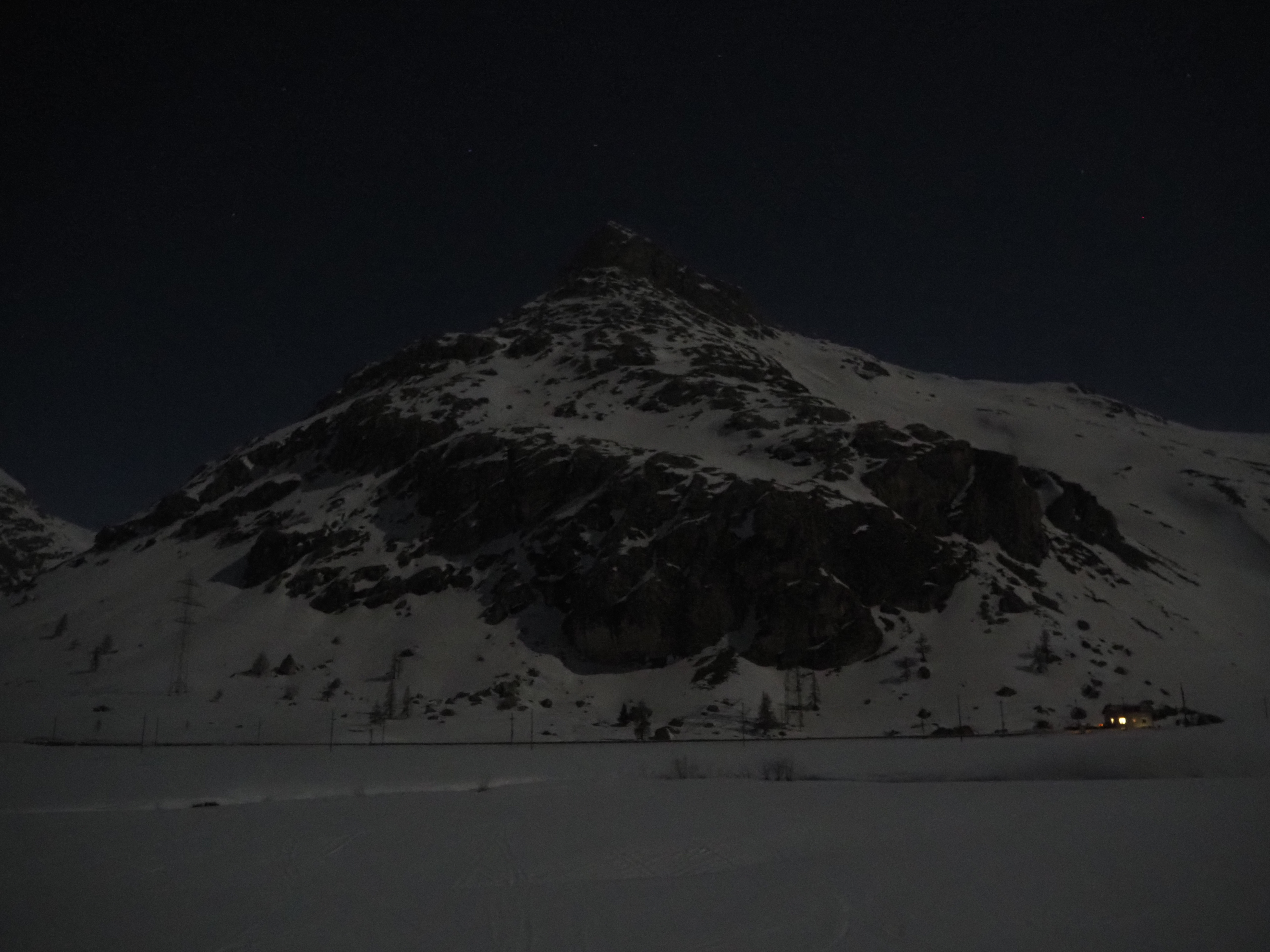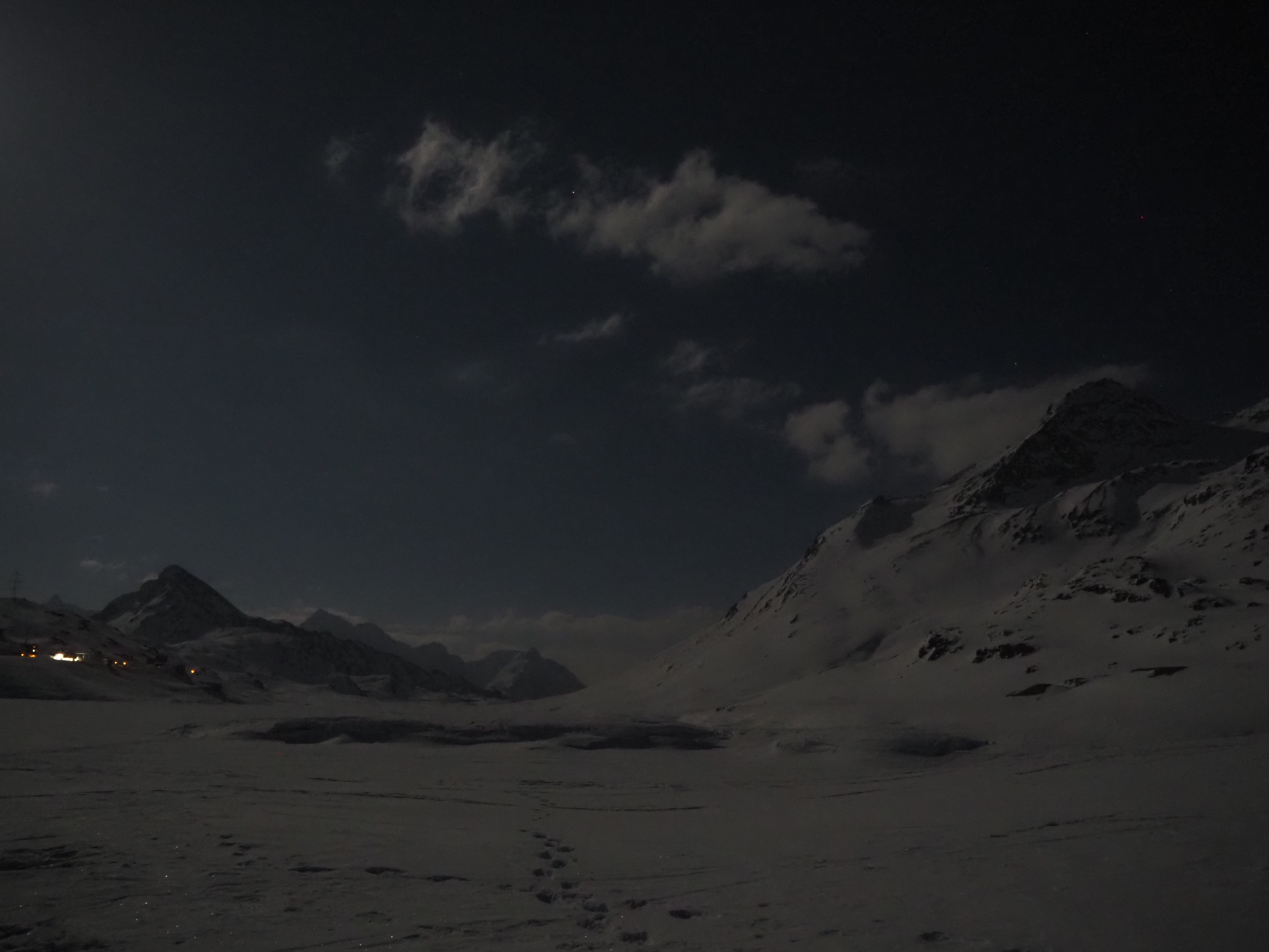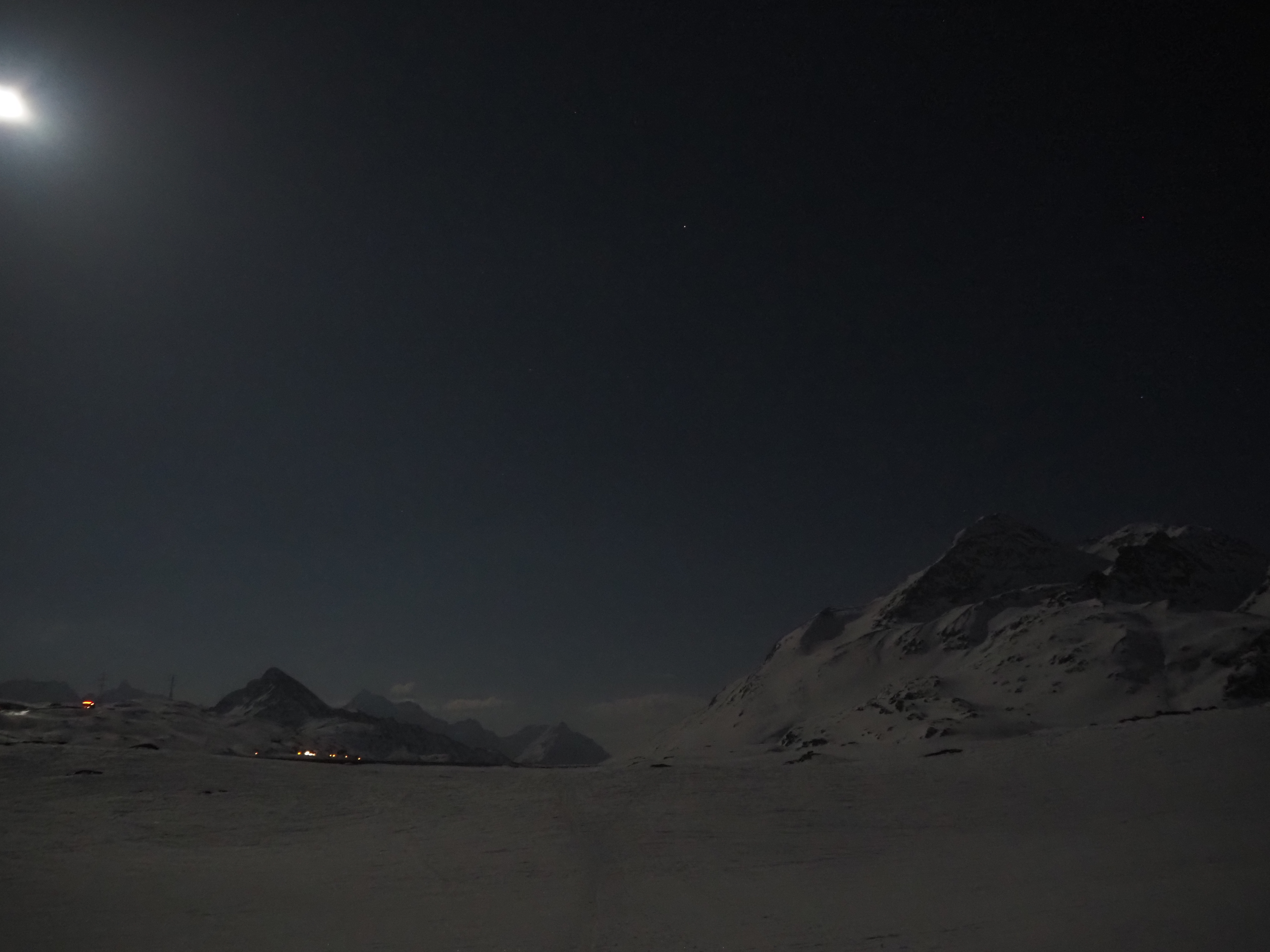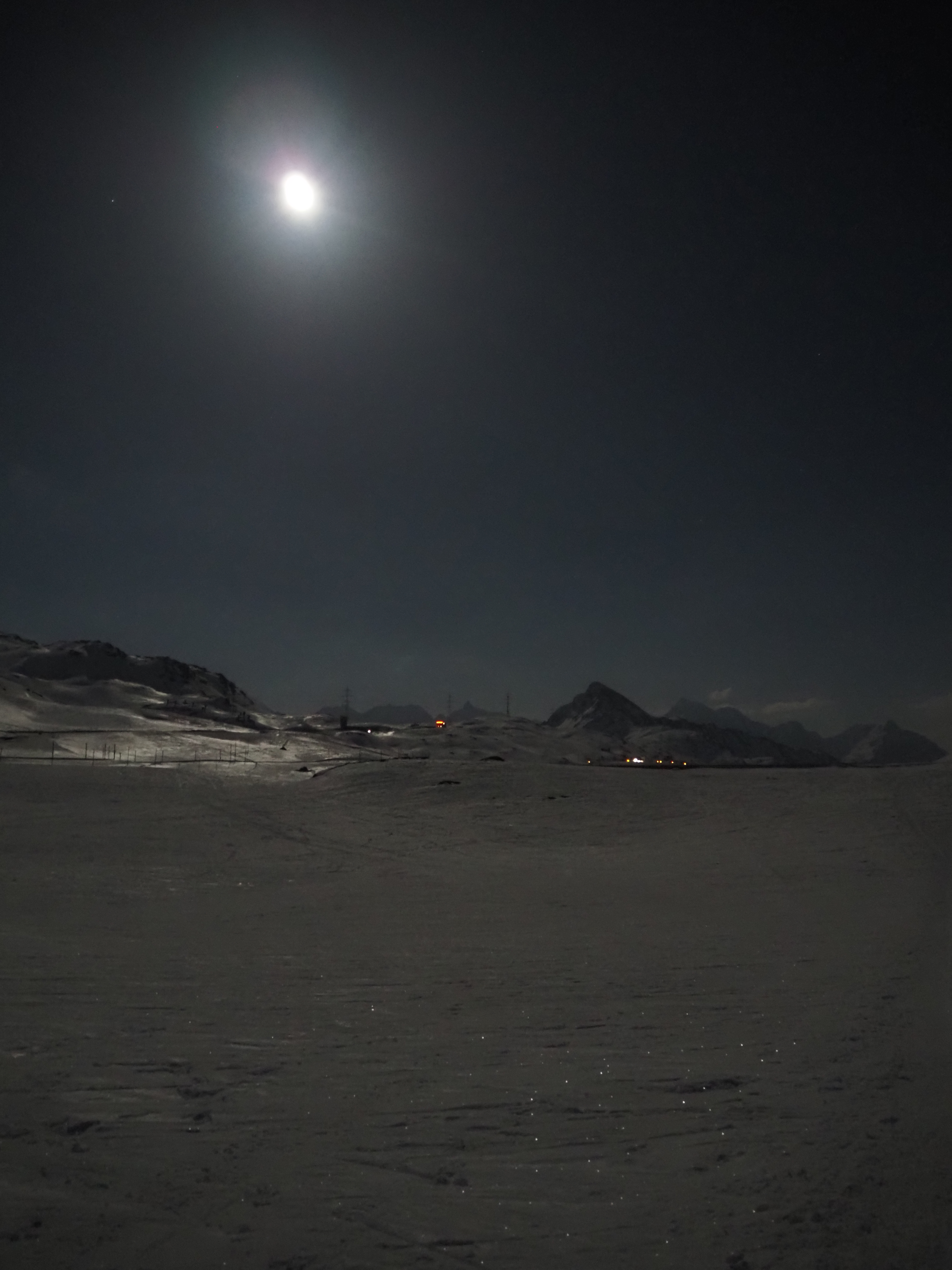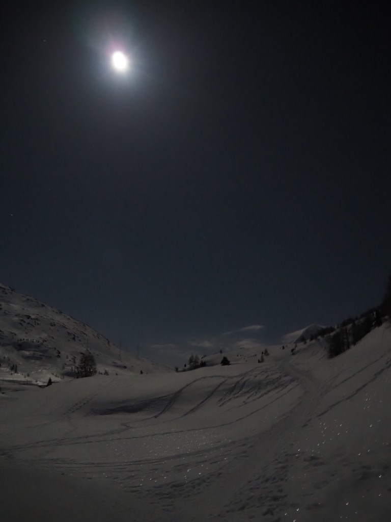 The mountain landscape is like another world. Some said it was comparable to Iceland. On the frozen Lago Bianco (Weisssee) we had a view all the way down to Protensina. The moon shone and made our headlamps unnecessary.