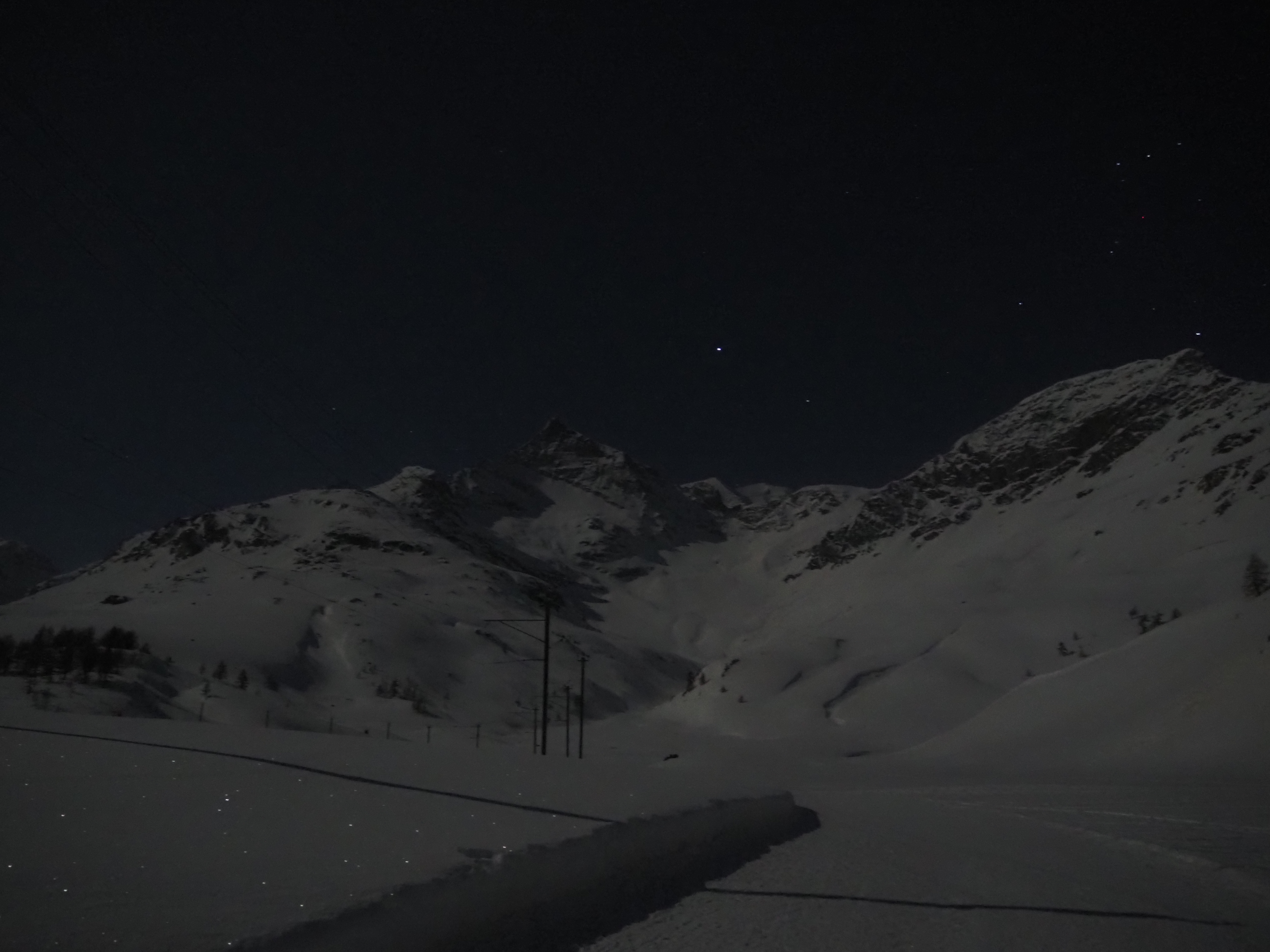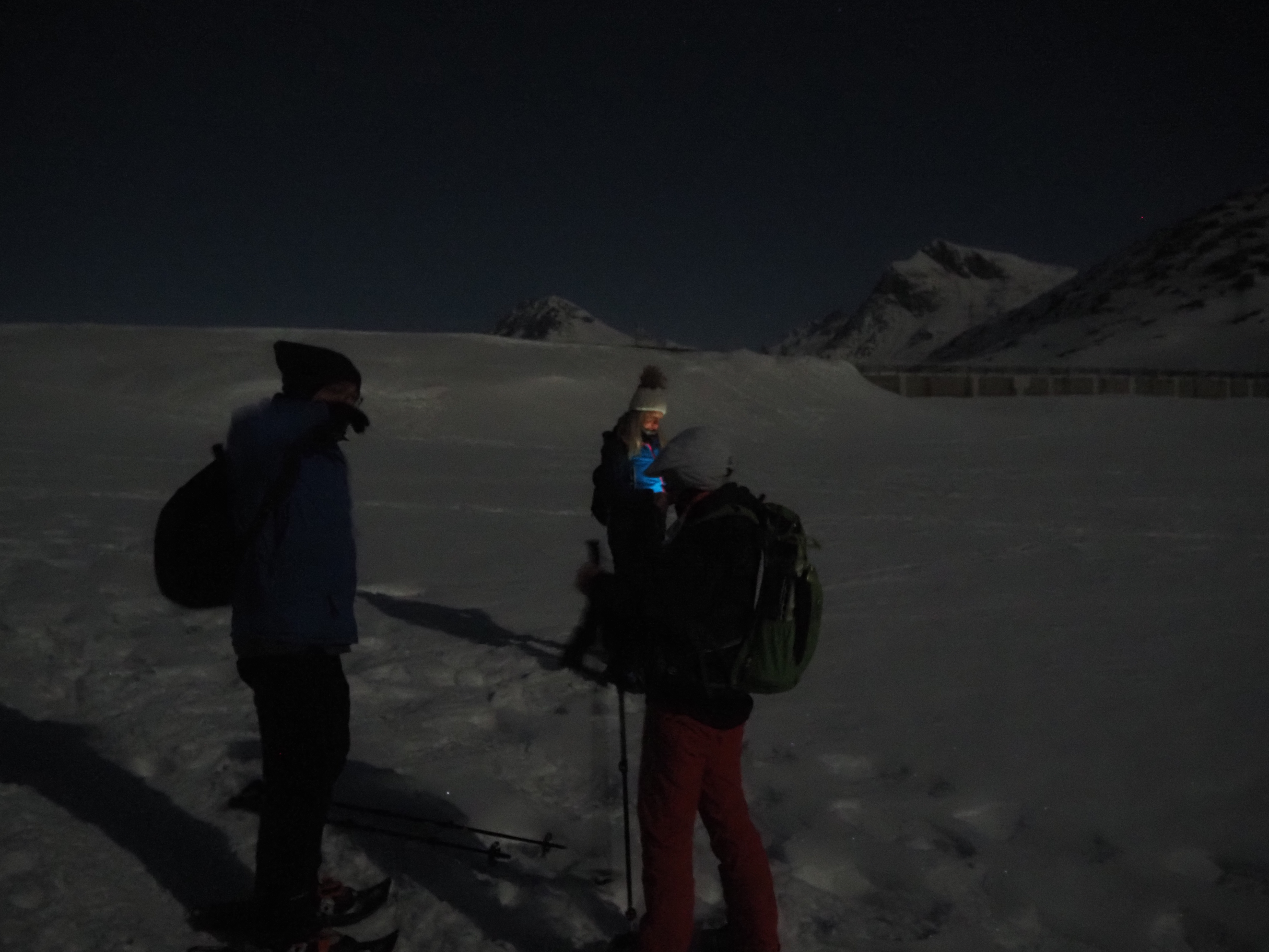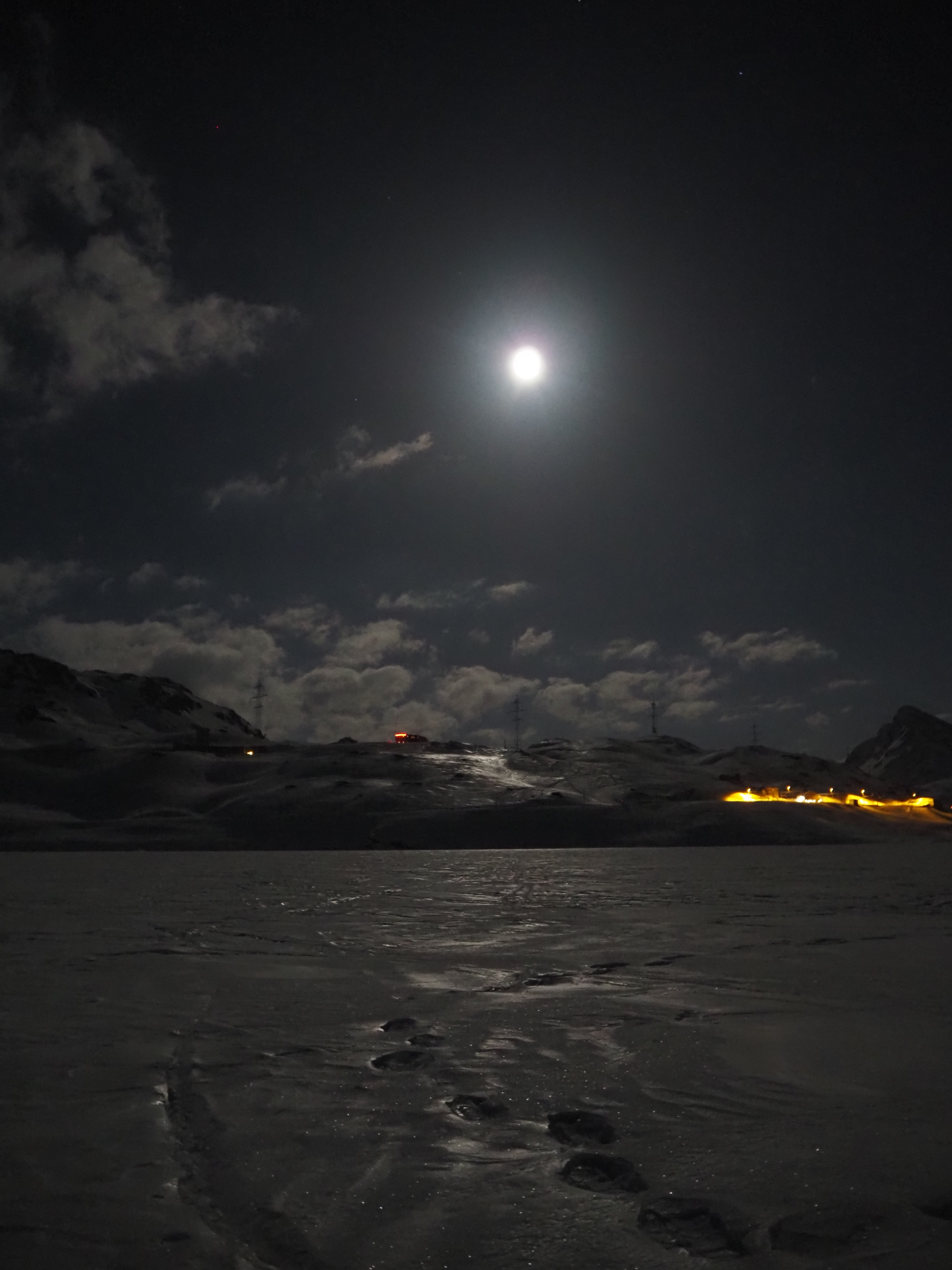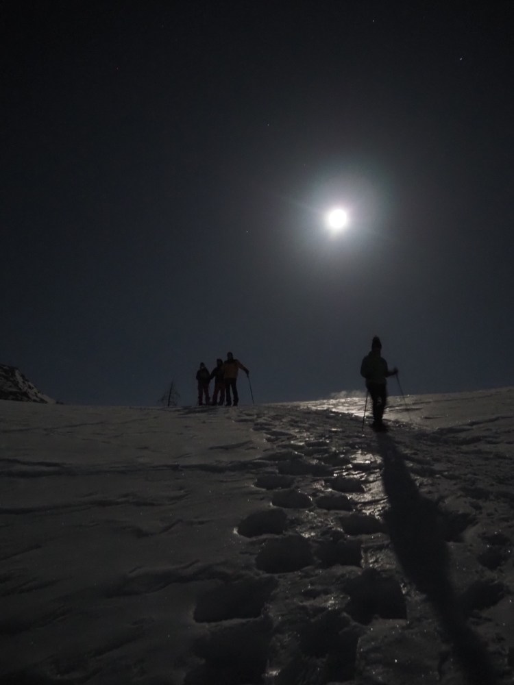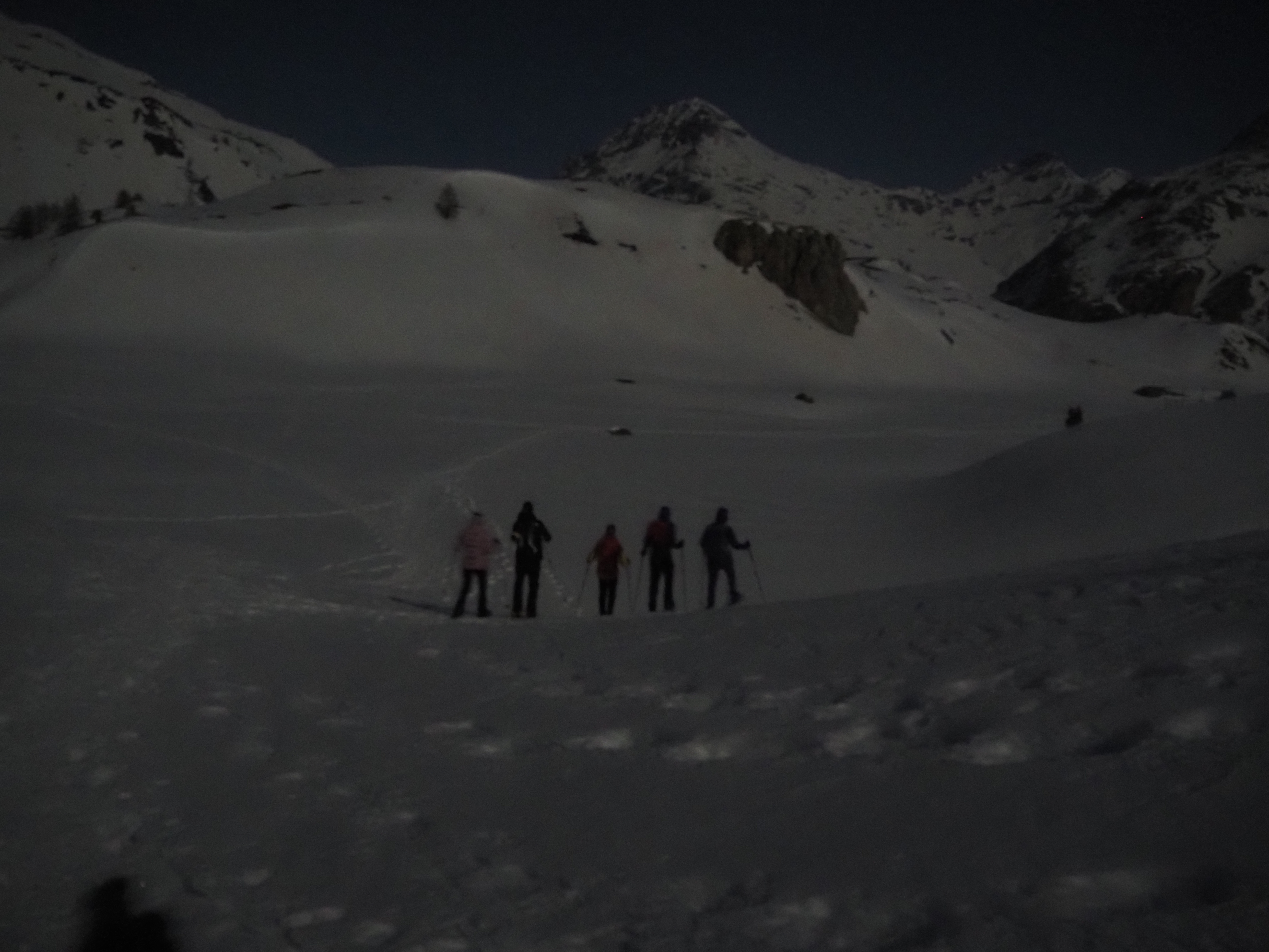 The mountain landscape is like another world. Some said it was comparable to Iceland. On the frozen Lago Bianco (Weisssee) we had a view all the way down to Protensina. The moon shone and made our headlamps unnecessary.