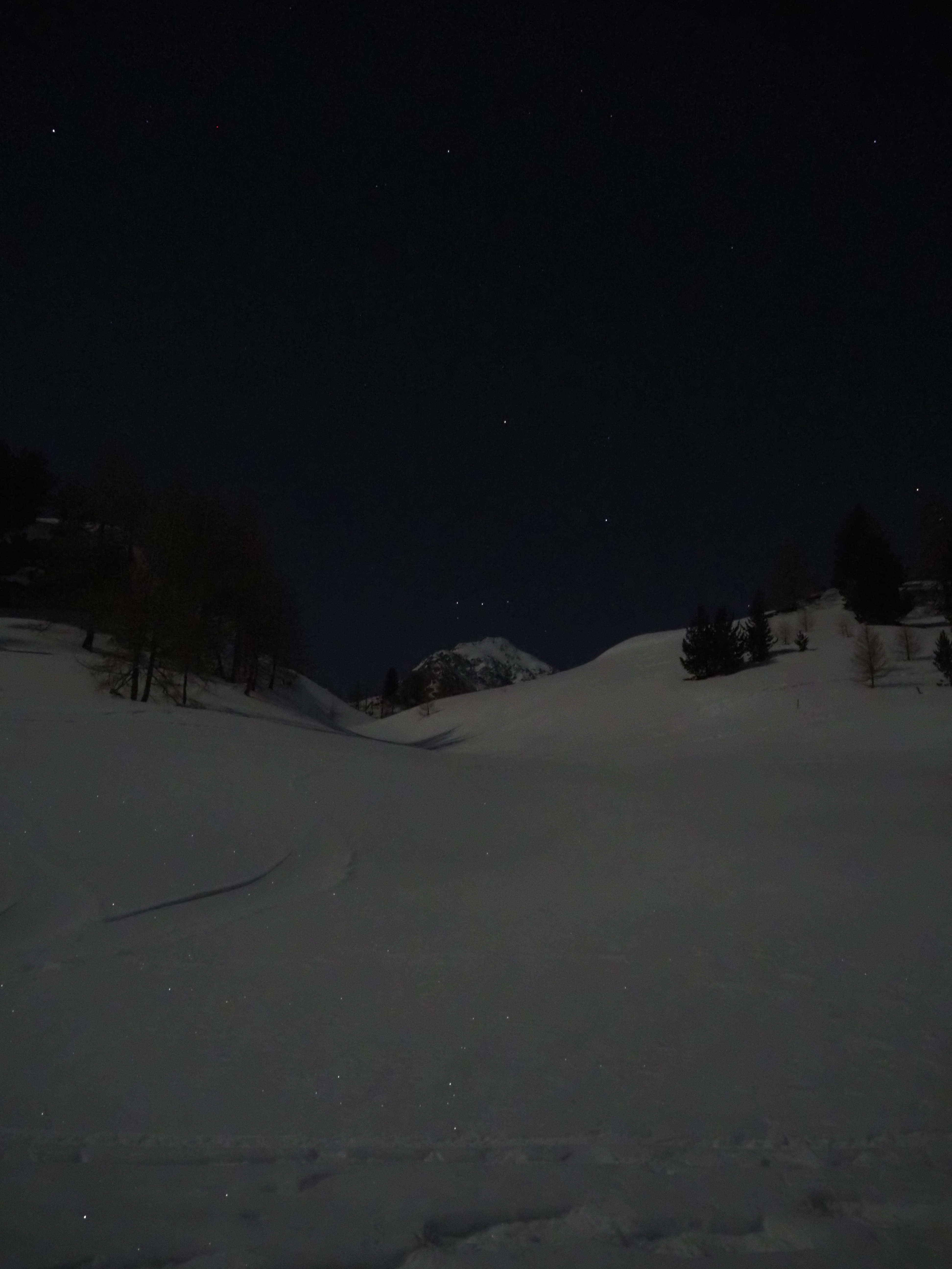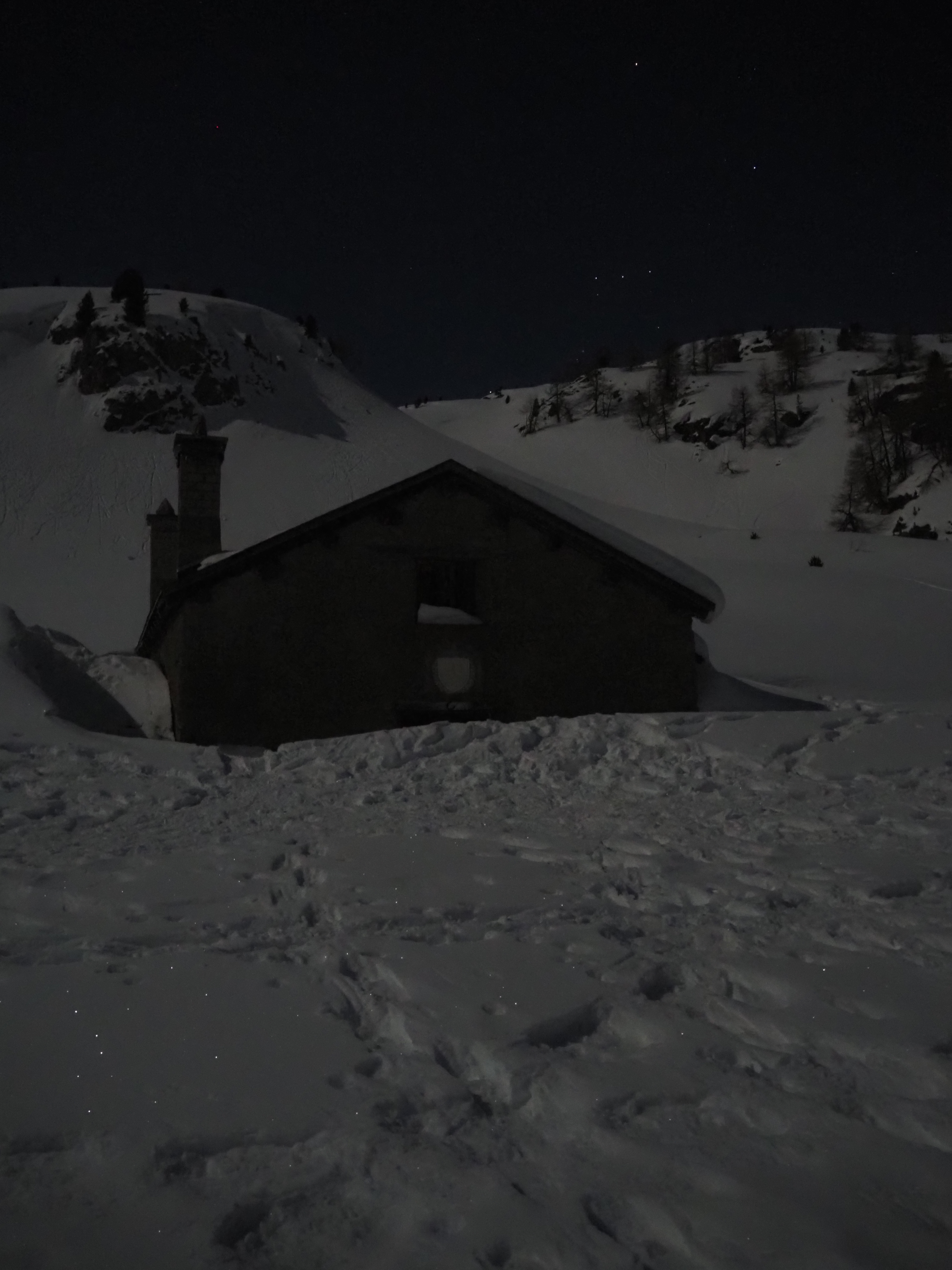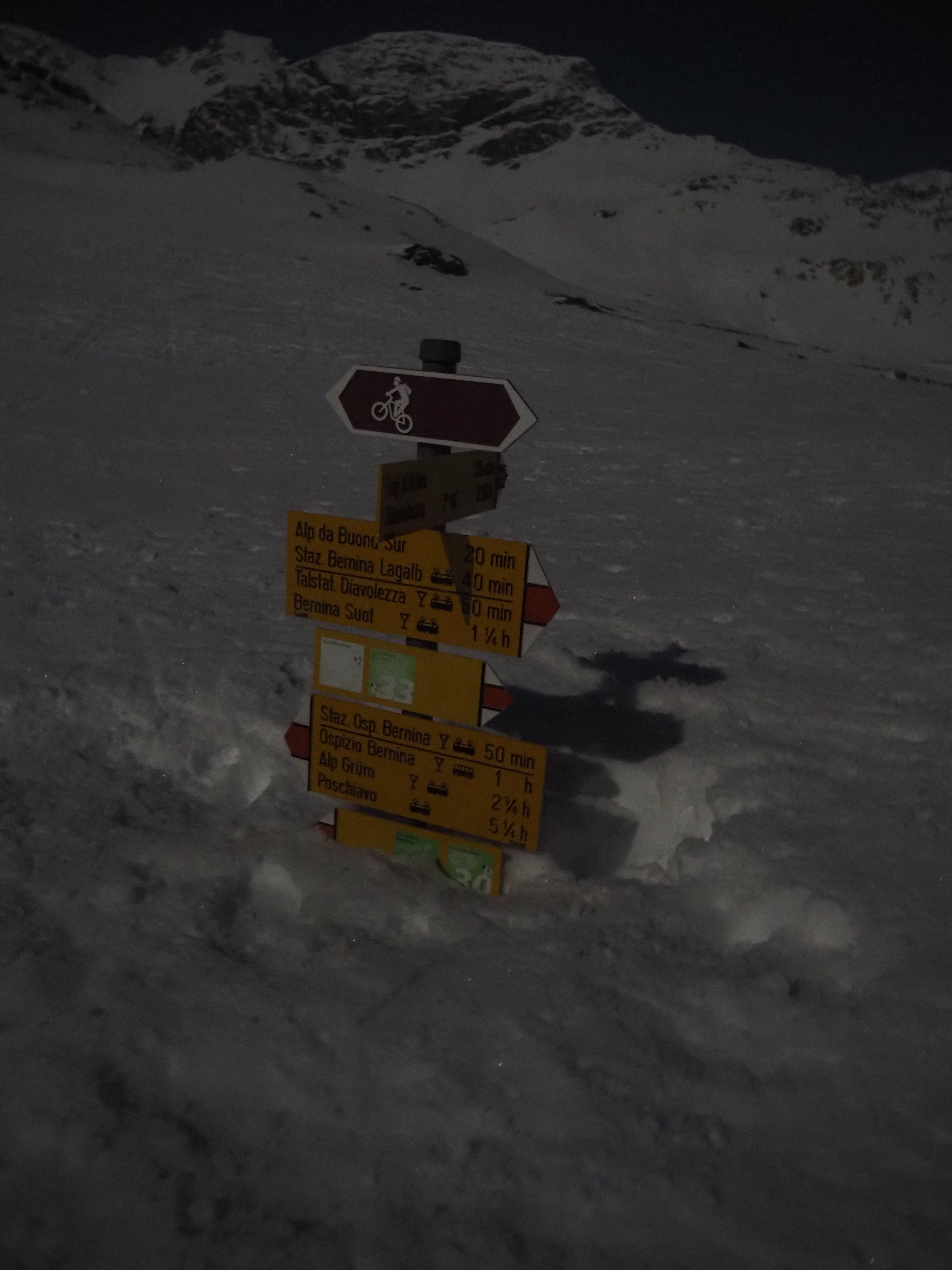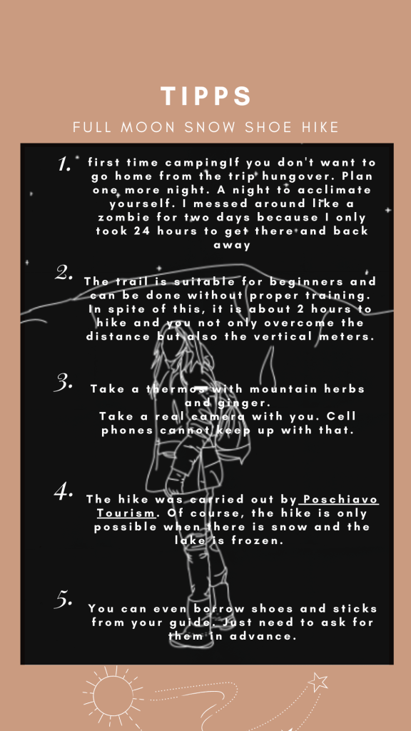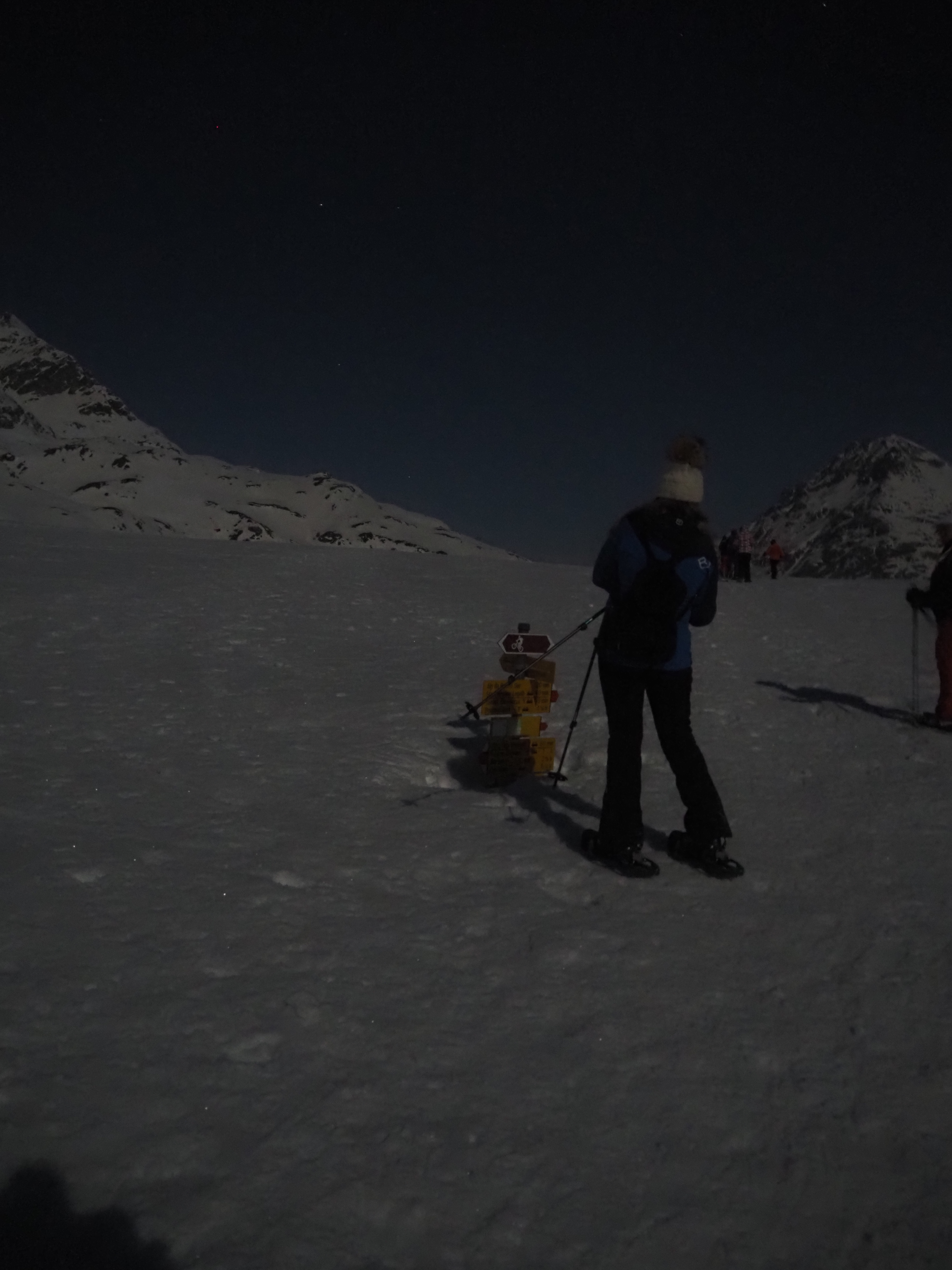 The mountain landscape is like another world. Some said it was comparable to Iceland. On the frozen Lago Bianco (Weisssee) we had a view all the way down to Protensina. The moon shone and made our headlamps unnecessary.